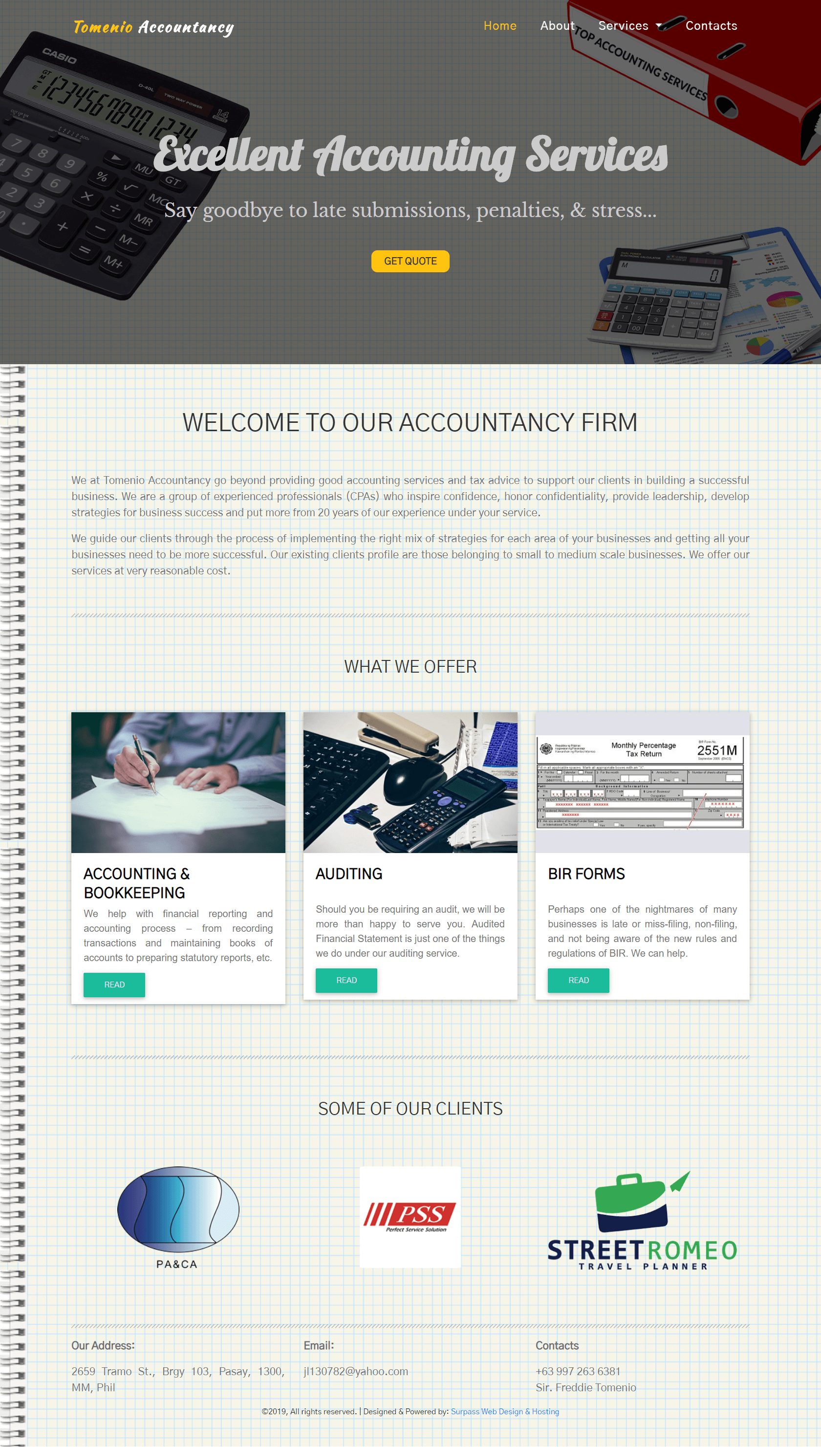 A quick information website for a certain accountancy agency in Paranaque. What I enjoyed about it was how I could come up with a relevant design style by implementing a checkered background and a spiral notebook! :)